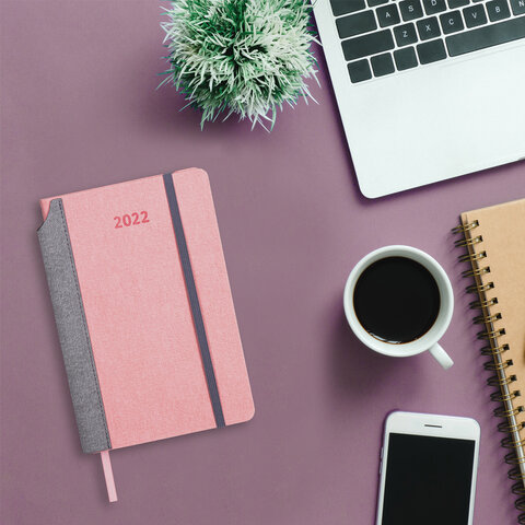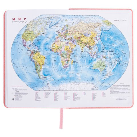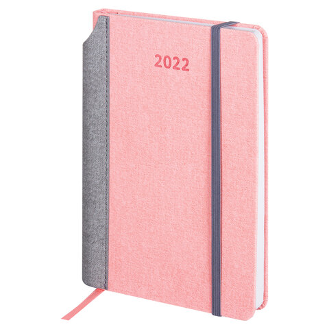Внутренний блок включает 168 листов белой бумаги плотностью 70 г/м2. Каждая страничка имеет перфорированный угол. Благодаря стандартному формату А5 (138х213 мм) ежедневник удобно использовать как в офисе, так и на выездных деловых встречах. Жесткая книжная обложка стилизована под искусственную кожу с текстурой льна, фиксируется резинкой, поэтому ежедневник не откроется в сумке или портфеле и страницы не помнутся. Материал обложки подходит для горячего тиснения. Для удобства пользования ежедневник снабжен клапаном для фиксации ручки. Форзац ежедневника представлен картами мира и России. Дополнением является закладка-ляссе, с помощью которой при необходимости можно быстро открыть ежедневник на нужной странице. Помимо прочего, ежедневник снабжен обширным справочным материалом. Выполнен в стильном сочетании розового и серого цветов.