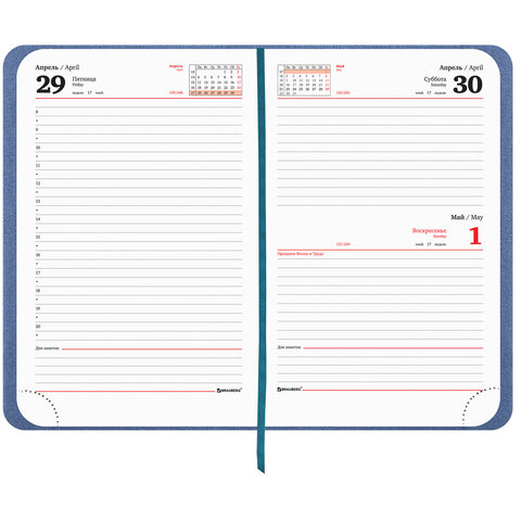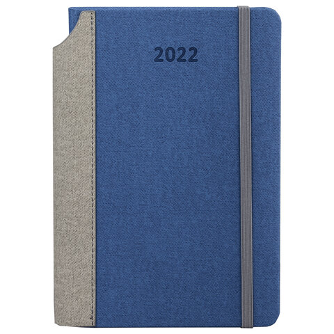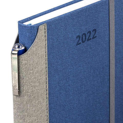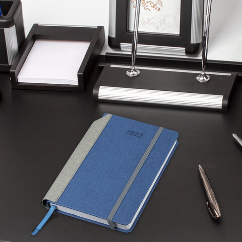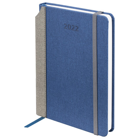 Внутренний блок включает 168 листов белой бумаги плотностью 70 г/м2. Каждая страничка имеет перфорированный угол. Благодаря стандартному формату А5 (138х213 мм) ежедневник удобно использовать как в офисе, так и на выездных деловых встречах. Жесткая книжная обложка стилизована под искусственную кожу с текстурой льна, фиксируется резинкой, поэтому ежедневник не откроется в сумке или портфеле и страницы не помнутся. Материал обложки подходит для горячего тиснения. Для удобства пользования ежедневник снабжен клапаном для фиксации ручки. Форзац ежедневника представлен картами мира и России. Дополнением является закладка-ляссе, с помощью которой при необходимости можно быстро открыть ежедневник на нужной странице. Помимо прочего, ежедневник снабжен обширным справочным материалом. Выполнен в стильном сочетании синего и серого цветов.