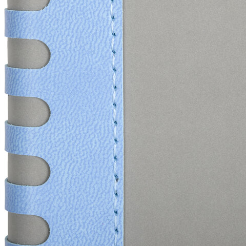 Внутренний блок включает 168 листов кремовой бумаги плотностью 70 г/м2. Каждая страничка имеет перфорированный угол. Благодаря стандартному формату А5 (138х213 мм) ежедневник удобно использовать как в офисе, так и на выездных деловых встречах. Твердая книжная обложка стилизована под гладкую кожу. Комбинированный материал обложки подходит для горячего тиснения. Срез ежедневника окрашен в цвет держателя для ручки, что придает ему особый шарм. Дополнением является закладка-ляссе, с помощью которой при необходимости можно быстро открыть ежедневник на нужной странице. Помимо прочего, ежедневник снабжен обширным справочным материалом. Выполнен в стильном сочетании голубого и серого цветов.