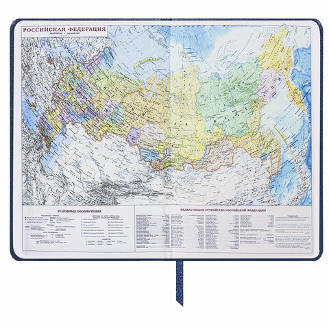 Внутренний блок включает 168 листов белой бумаги плотностью 70 г/м2. Каждая страничка имеет перфорированный угол. Благодаря стандартному формату А5 (138х213 мм) ежедневник удобно использовать как в офисе, так и на выездных деловых встречах. Жесткая книжная обложка с легкой рельефной фактурой напоминает натуральную кожу благородного синего цвета. Материал обложки - балакрон, подходит для тиснения только фольгой. Форзац ежедневника представлен картами мира и России. Дополнением является закладка-ляссе, с помощью которой при необходимости можно быстро открыть ежедневник на нужной странице. Помимо прочего, ежедневник снабжен обширным справочным материалом.