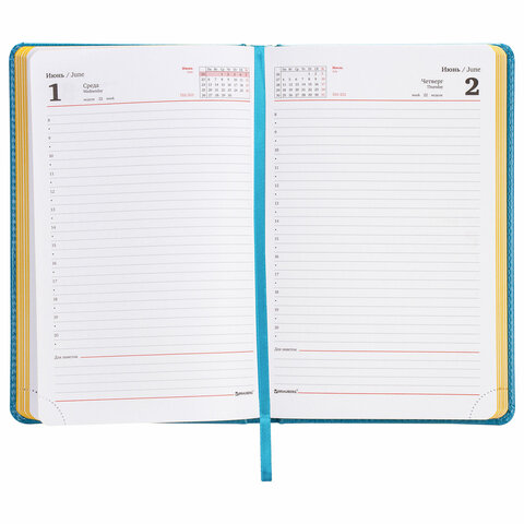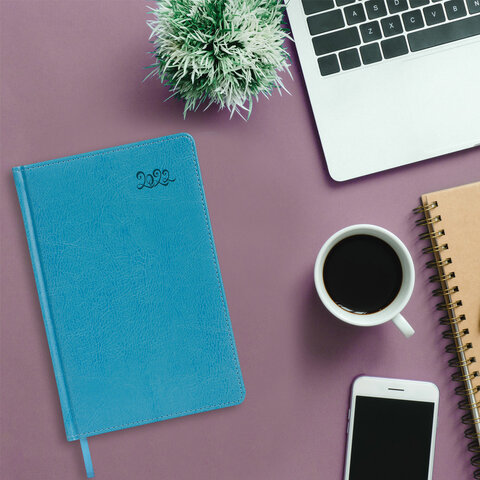 Внутренний блок включает 168 листов белой бумаги плотностью 70 г/м2. Каждая страничка имеет перфорированный угол. Благодаря стандартному формату А5 (138х213 мм) ежедневник удобно использовать как в офисе, так и на выездных деловых встречах. Твердая обложка стилизована под гладкую кожу яркого бирюзового цвета. Подходит для горячего тиснения. Срез и форзац ежедневника окрашены на контрасте с цветом обложки, что придает ему особый шарм. Дополнением является закладка-ляссе, с помощью которой при необходимости можно быстро открыть ежедневник на нужной странице. Помимо прочего, ежедневник снабжен обширным справочным материалом.
