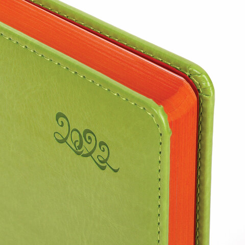 Внутренний блок включает 168 листов белой бумаги плотностью 70 г/м2. Каждая страничка имеет перфорированный угол. Благодаря стандартному формату А5 (138х213 мм) ежедневник удобно использовать как в офисе, так и на выездных деловых встречах. Твердая обложка стилизована под гладкую кожу яркого зеленого цвета. Подходит для горячего тиснения. Срез и форзац ежедневника окрашены на контрасте с цветом обложки, что придает ему особый шарм. Дополнением является закладка-ляссе, с помощью которой при необходимости можно быстро открыть ежедневник на нужной странице. Помимо прочего, ежедневник снабжен обширным справочным материалом.