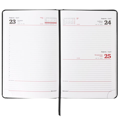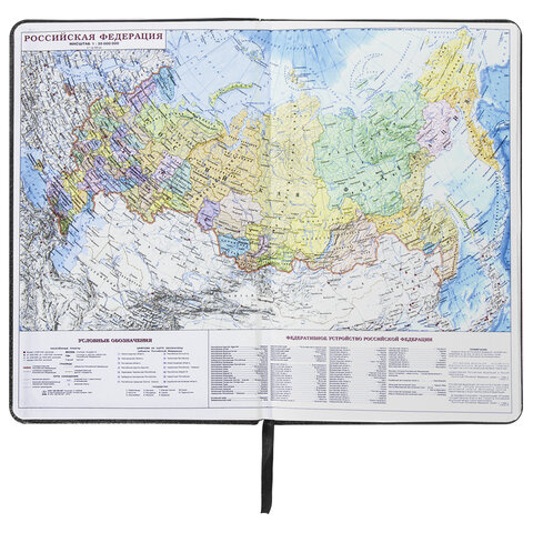 Внутренний блок включает 168 листов белой бумаги плотностью 70 г/м2. Каждая страничка имеет перфорированный угол. Благодаря стандартному формату А5 (138х213 мм) ежедневник удобно использовать как в офисе, так и на выездных деловых встречах. Жесткая книжная обложка, с легкой рельефной фактурой, напоминает натуральную кожу классического черного цвета. Материал обложки - балакрон, подходит для тиснения только фольгой. Форзац ежедневника представлен картами мира и России. Дополнением является закладка-ляссе, с помощью которой при необходимости можно быстро открыть ежедневник на нужной странице. Помимо прочего, ежедневник снабжен обширным справочным материалом.