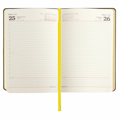 Внутренний блок включает 168 листов тонированной бумаги плотностью 70 г/м2. Каждая страничка имеет перфорированный угол. Благодаря стандартному формату А5 (138х213 мм) ежедневник удобно использовать как в офисе, так и на выездных деловых встречах. Мягкая (интегральная) обложка стилизована под фактурную кожу неординарного желтого цвета. Подходит для горячего тиснения. Дополнением является закладка-ляссе, с помощью которой при необходимости можно быстро открыть ежедневник на нужной странице. Помимо прочего, ежедневник снабжен справочным материалом.