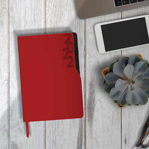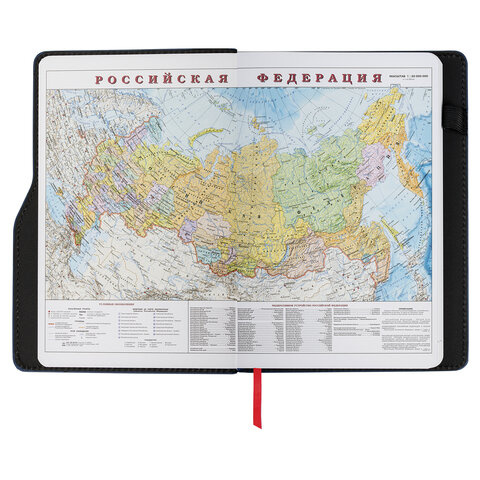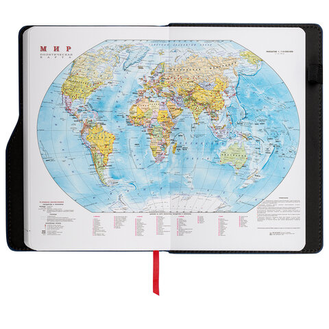 Внутренний блок включает 168 листов белой бумаги плотностью 70 г/м2. Каждая страничка имеет перфорированный угол. Благодаря стандартному формату А5 (138х213 мм) ежедневник удобно использовать как в офисе, так и на выездных деловых встречах. Жесткая книжная обложка, прошитая по периметру, с текстурой под гладкую кожу и эффектом софт-тач. Материал обложки подходит для горячего тиснения. Для удобства пользования ежедневник снабжен держателем для ручки. Форзац ежедневника представлен картами мира и России. Дополнением является закладка-ляссе, с помощью которой при необходимости можно быстро открыть ежедневник на нужной странице. Помимо прочего, ежедневник снабжен обширным справочным материалом. Выполнен в благородном бордовом цвете.