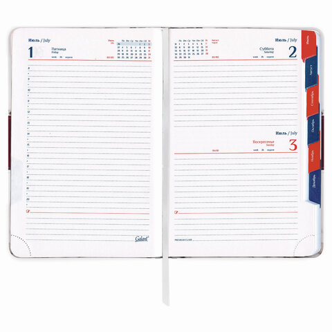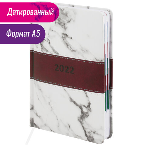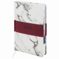 Внутренний блок включает 168 листов белой бумаги плотностью 70 г/м2. Каждая страничка имеет перфорированный угол. Благодаря стандартному формату А5 (148х218 мм) ежедневник удобно использовать как в офисе, так и на выездных деловых встречах. Твердая обложка состоит из двух материалов и стилизована под мрамор с вставкой из материала под гладкую кожу. Материал обложки подходит для горячего тиснения. Дополнением является закладка-ляссе, с помощью которой при необходимости можно быстро открыть ежедневник на нужной странице, а также вырубка по месяцам. Помимо прочего, ежедневник снабжен обширным справочным материалом.