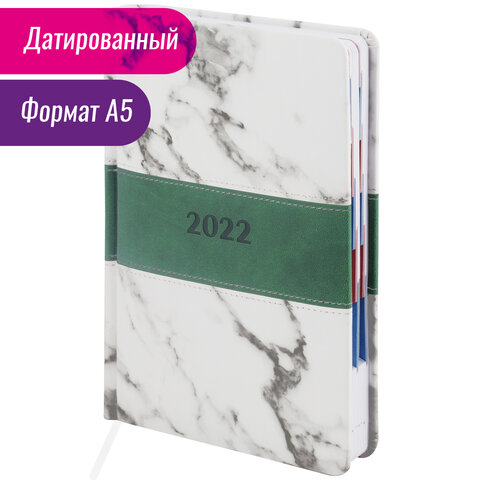 Внутренний блок включает 168 листов белой бумаги плотностью 70 г/м2. Каждая страничка имеет перфорированный угол. Благодаря стандартному формату А5 (148х218 мм) ежедневник удобно использовать как в офисе, так и на выездных деловых встречах. Твердая обложка состоит из двух материалов и стилизована под мрамор с вставкой из материала под гладкую кожу. Материал обложки подходит для горячего тиснения. Дополнением является закладка-ляссе, с помощью которой при необходимости можно быстро открыть ежедневник на нужной странице, а также вырубка по месяцам. Помимо прочего, ежедневник снабжен обширным справочным материалом.