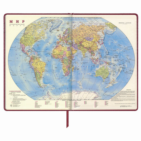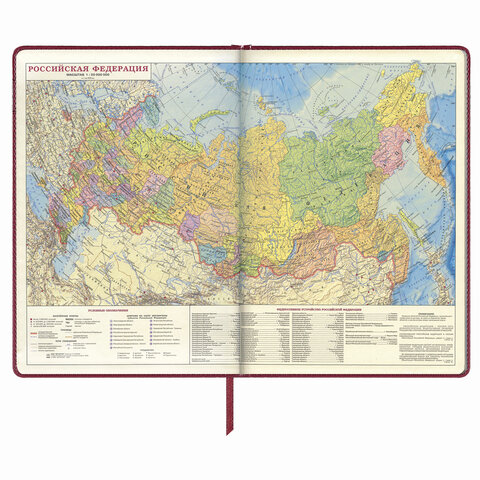 Внутренний блок включает 168 листов тонированной бумаги плотностью 70 г/м2. Каждая страничка имеет перфорированный угол. Благодаря большому формату А4 ежедневник удобно использовать как в офисе, так и на выездных деловых встречах. Твердая обложка стилизована под гладкую кожу благородного бордового цвета. Материал обложки подходит для горячего тиснения. Форзац ежедневника представлен картами мира и России. Дополнением является закладка-ляссе, с помощью которой при необходимости можно быстро открыть ежедневник на нужной странице. Помимо прочего, ежедневник снабжен обширным справочным материалом.