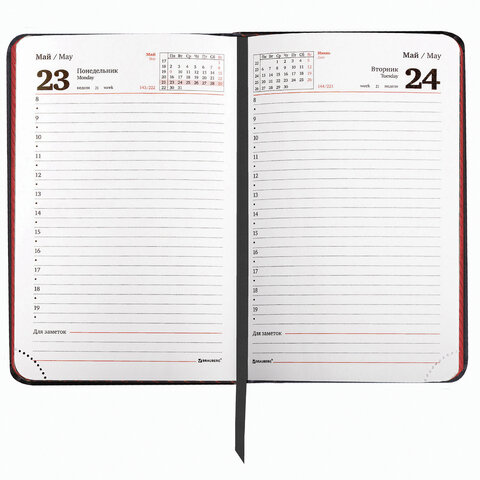 Внутренний блок включает 168 листов белой бумаги плотностью 70 г/м2. Каждая страничка имеет перфорированный угол. Благодаря стандартному формату А6 (100х150 мм) ежедневник удобно использовать как в офисе, так и на выездных деловых встречах. Жесткая книжная обложка стилизована под гладкую кожу. Материал обложки подходит для горячего тиснения и при лазерной гравировке меняет черный цвет на красный. Срез ежедневника окрашен в цвет термотиснения, а форзац в цвет обложки, что придает ему особый шарм. Дополнением является закладка-ляссе, с помощью которой при необходимости можно быстро открыть ежедневник на нужной странице. Помимо прочего, ежедневник снабжен обширным справочным материалом.