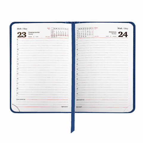 Внутренний блок включает 168 листов тонированной бумаги плотностью 70 г/м2. Каждая страничка имеет перфорированный угол. Благодаря малому формату А6 (100х150 мм) ежедневник удобно использовать как в офисе, так и на выездных деловых встречах. Твердая обложка прошита по периметру, с легкой рельефной фактурой, напоминающей натуральную кожу. Материал обложки подходит для горячего тиснения. Форзац ежедневника представлен картами мира и России. Дополнением является закладка-ляссе, с помощью которой при необходимости можно быстро открыть ежедневник на нужной странице. Помимо прочего, ежедневник снабжен обширным справочным материалом. Выполнен в благородном синем цвете.