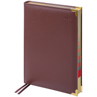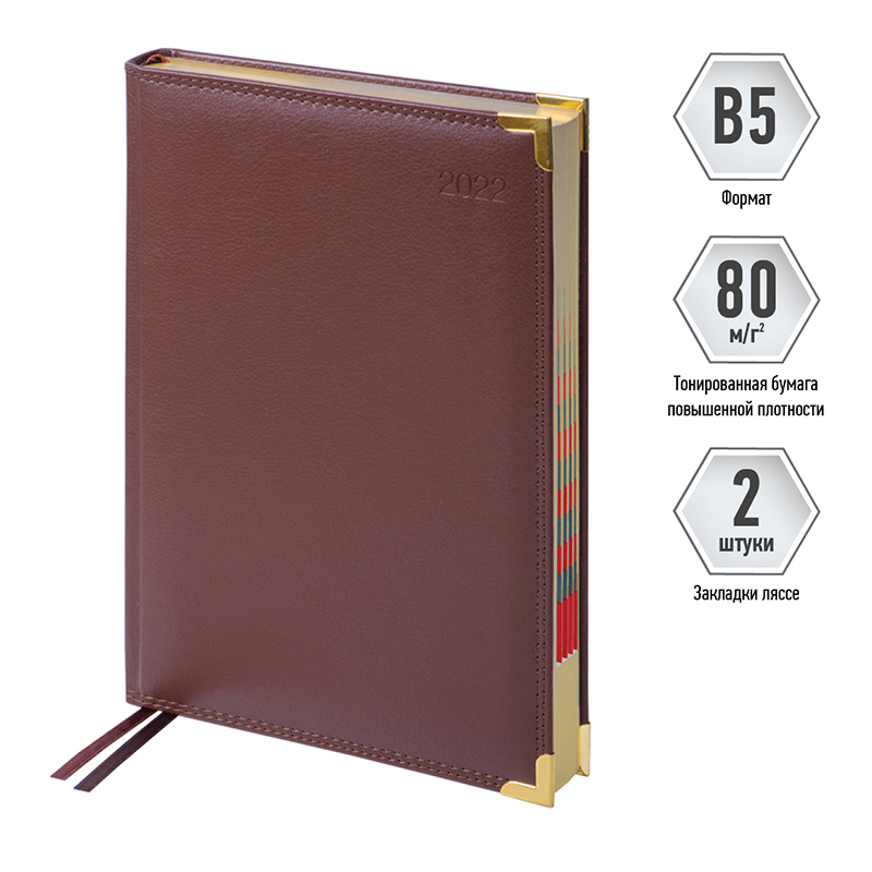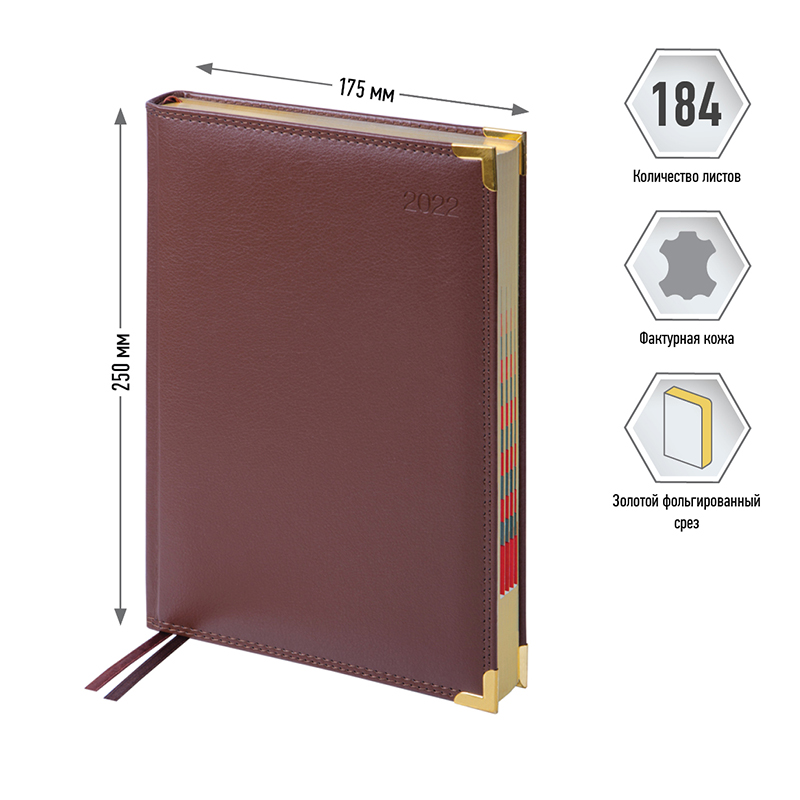 Изысканные ежедневники Delucci изготовлены из премиального рельефного кожзаменителя, имитирующего кожу первоклассной выделки. Ежедневник датированный формата B5 (175*250 мм) с обложкой с поролоновой прослойкой. Прошивка обложки двойной строчкой. Золотые металлические уголки. Золотой фольгированный срез блока. 184 листа. Цвет обложки - коричневый. Высококачественная кремовая бумага повышенной плотности 80 г/м2, пантонная печать блока в 2 краски, справочный материал, географические карты на форзацах. Перфорированные уголки блока. 2 закладки-ляссе. Отрывные заметки и бланки-извещения о ДТП. Вырубной блок по неделям. Подарочная матовая индивидуальная упаковка. В подарок 3 комплекта стикеров.