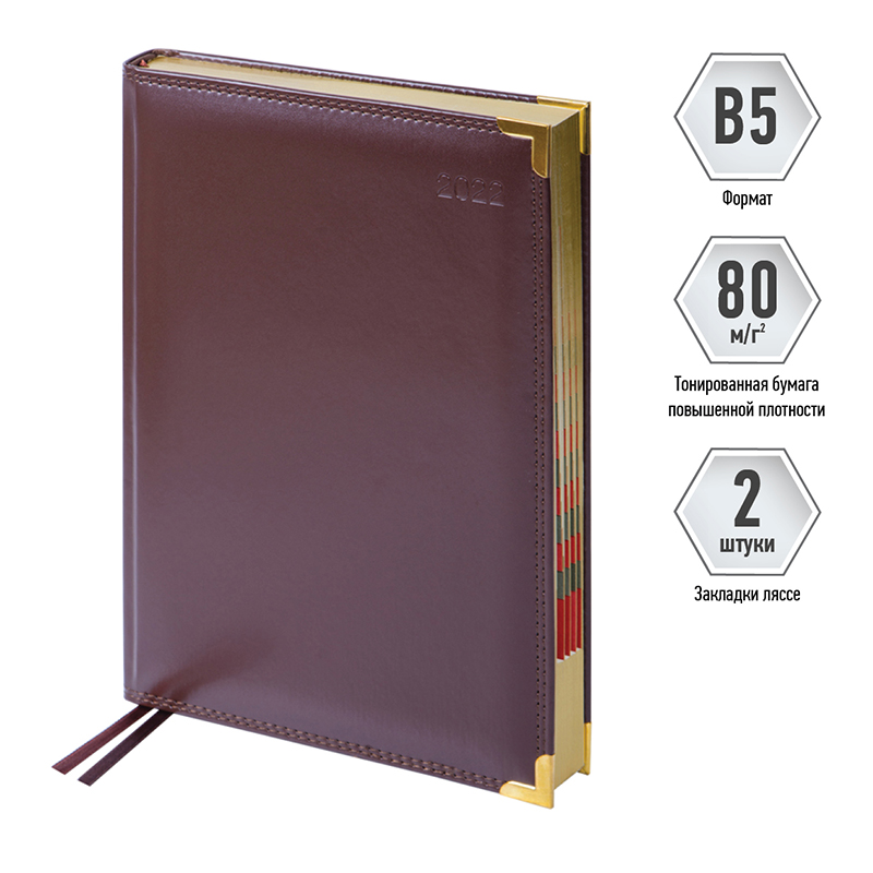 Изысканные ежедневники Delucci изготовлены из премиального глянцевого кожзаменителя, имитирующего кожу первоклассной выделки. Ежедневник датированный формата B5 (175*250 мм) с обложкой с поролоновой прослойкой. Прошивка обложки двойной строчкой. Золотые металлические уголки. Золотой фольгированный срез блока. 184 листа. Цвет обложки - коричневый. Высококачественная кремовая бумага повышенной плотности 80 г/м2, пантонная печать блока в 2 краски, справочный материал, географические карты на форзацах. Перфорированные уголки блока. 2 закладки-ляссе. Отрывные заметки и бланки-извещения о ДТП. Вырубной блок по неделям. Подарочная матовая индивидуальная упаковка. В подарок 3 комплекта стикеров.