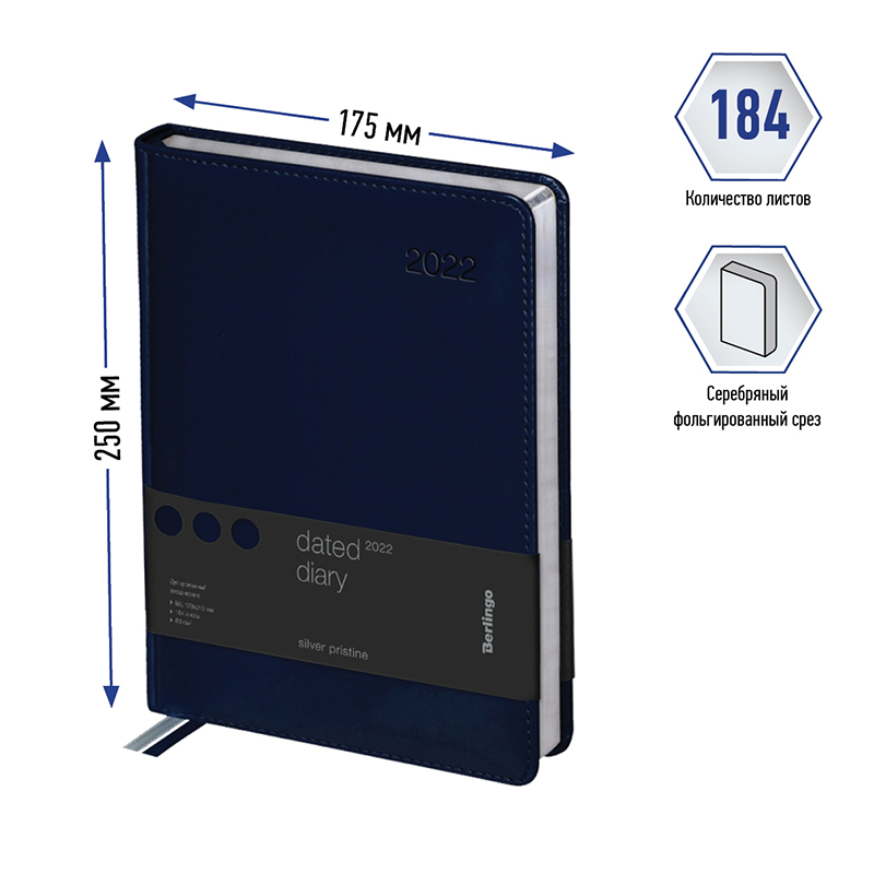 Ежедневник датированный 2022г., А4-(B5), 184л., кожзам, Berlingo 'Silver Pristine', сер. срез, синий
