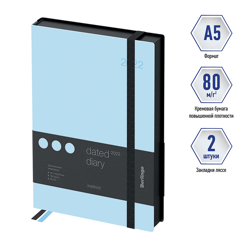 Ежедневники Berlingo Instinct изготовлены из матовой искусственной кожи c эффектом soft-touch. Сочетание двух контрастных цветов обложки: пастельного голубого и черного. Твердая обложка с прострочкой по корешку. Черный срез блока. Вертикальная черная фиксирующая резинка увеличенной ширины 9мм. Запечатанные форзацы. Внутренний блок из 184 листов высококачественной кремовой бумаги повышенной плотности 80 г/м?, пантонная печать в 2 краски, справочный материал и перфорированные уголки. Индивидуальная упаковка. Подходят под персонализацию: трафаретная печать, УФ-печать, тиснение фольгой, блинтовое тиснение, лазерная гравировка, шильд.
