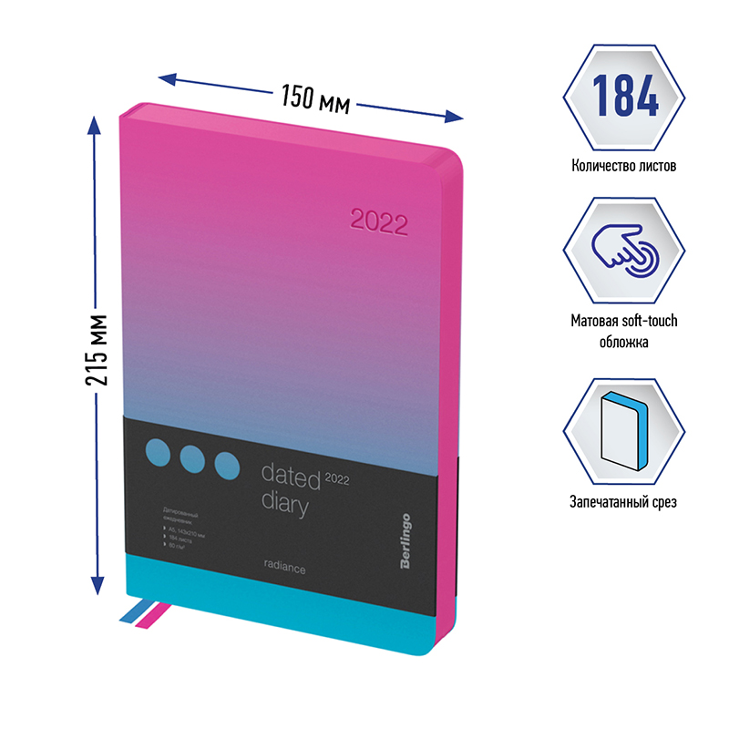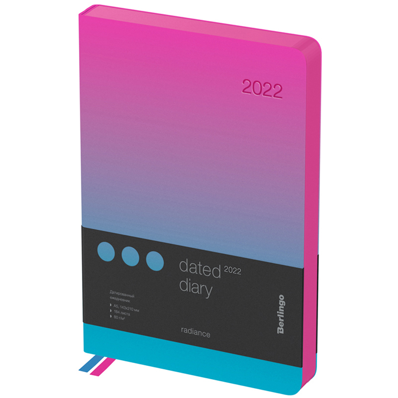 Ежедневники Berlingo Radiance в мягкой обложке из искусственной кожи в яркой обложке с дизайном градиент с контрастным форзацем. Цвет - розово-синий. Внутренний блок из 184 листов высококачественной кремовой бумаги повышенной плотности 80 г/м?, пантонная печать в 2 краски, справочный материал. Перфорированные уголки блока. 2 закладки-ляссе. Отрывные заметки и бланки извещения о ДТП. Прошитый блок. Подходит под персонализацию. В подарок 3 комплекта стикеров.