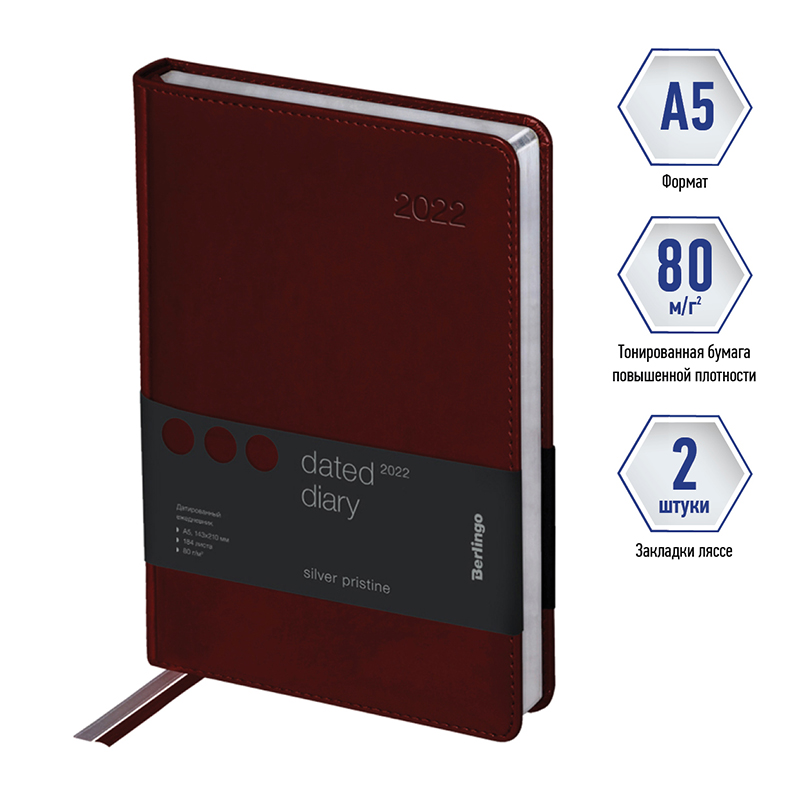 Ежедневники Berlingo Silver Pristine изготовлены из глянцевого кожзаменителя, имитирующего лакированную кожу первоклассной выделки. Ежедневник датированный формата А5 (150*215 мм) с обложкой с поролоновой прослойкой и прострочкой по периметру. Серебряный фольгированный срез блока. 184 листа. Цвет обложки - коричневый. Высококачественная кремовая бумага повышенной плотности 80 г/м2, пантонная печать блока в 2 краски, справочный материал, географические карты на форзацах. Перфорированные уголки блока. 2 закладки-ляссе. Отрывные заметки и бланки-извещения о ДТП. В подарок 3 комплекта стикеров.