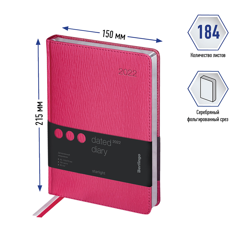 Ежедневник датированный 2022г., А5, 184л., кожзам, Berlingo 'Starlight', сер. срез, фуксия