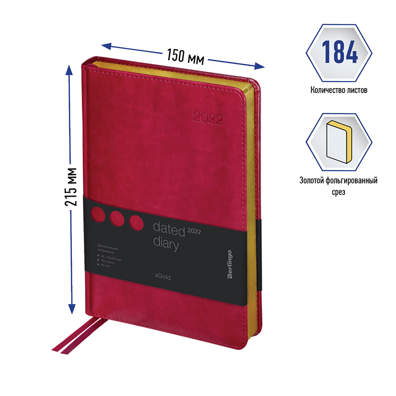 Ежедневник датированный 2022г., А5, 184л., кожзам, Berlingo 'xGold', зол. срез, фуксия