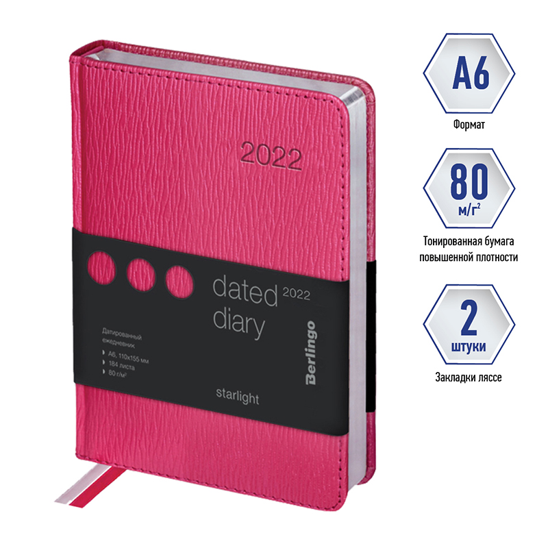 Ежедневник датированный 2022г., А6, 184л., кожзам, Berlingo 'Starlight', сер. срез, фуксия
