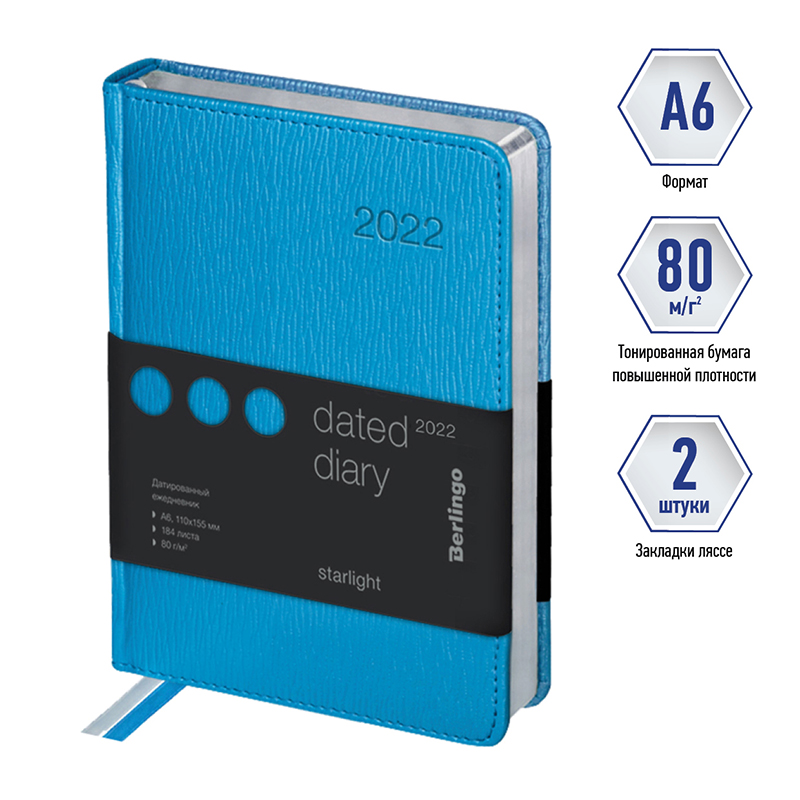 Ежедневники Berlingo Starlight изготовлены из высококачественного кожзаменителя с эффектом блеска и крупной продольной текстурой. Ежедневник датированный формата А6 (115*160 мм) с обложкой с поролоновой прослойкой и прострочкой по периметру. Серебряный фольгированный срез блока. 184 листа. Цвет обложки - голубой. Высококачественная кремовая бумага повышенной плотности 80 г/м2, пантонная печать блока в 2 краски, справочный материал, географические карты на форзацах. Перфорированные уголки блока. 2 закладки-ляссе. Отрывные заметки. В подарок 3 комплекта стикеров.