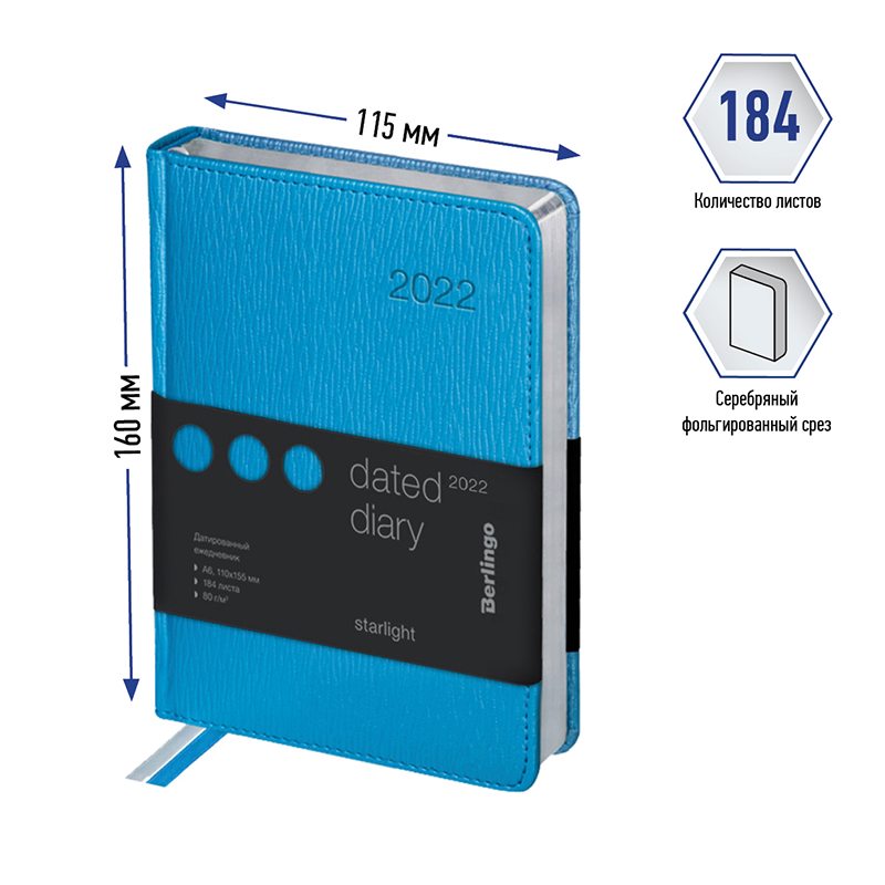 Ежедневник датированный 2022г., А6, 184л., кожзам, Berlingo 'Starlight', сер. срез, голубой