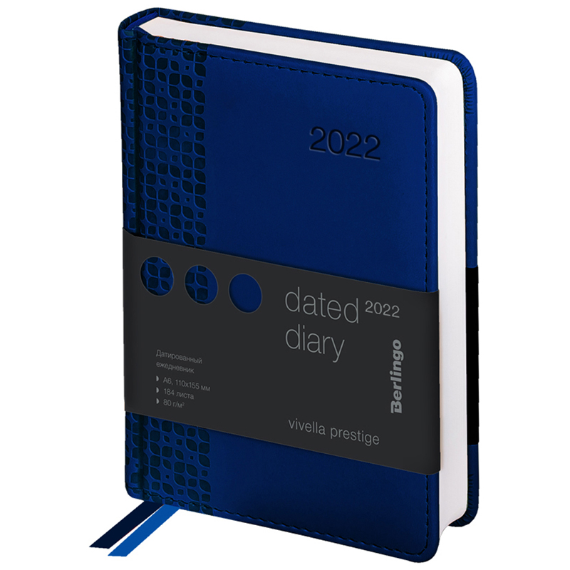 Стильный датированный ежедневник на 2022г. Berlingo Vivella Prestige формата A6 (110*155 мм) с классической твердой матовой обложкой из высококачественной экокожи. Цвет - синий. Имиджевое тиснение на обложке добавляет интересную деталь в насыщенной цвет обложки. Внутренний блок состоит из 184 листов высококачественной белой бумаги повышенной плотности 80 г/м? с пантонной печатью в 2 краски. Перфорированные уголки, справочная информация и 2 закладки-ляссе сделают использование ежедневника Berlingo Vivella Prestige комфортным. Внутри располагаются географическая карта, отрывные заметки, бланки извещения о ДТП и справочные материалы. 3 комплекта стикеров станут приятным подарком. Подходит под персонализацию.