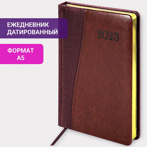 Ежедневник датированный 2023 А5 138x213 мм BRAUBERG 'Cayman', под кожу, коричневый, 114013