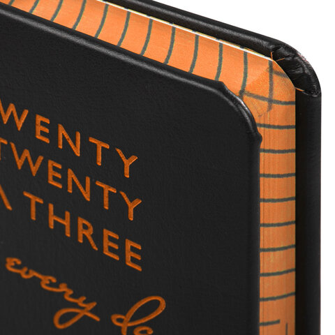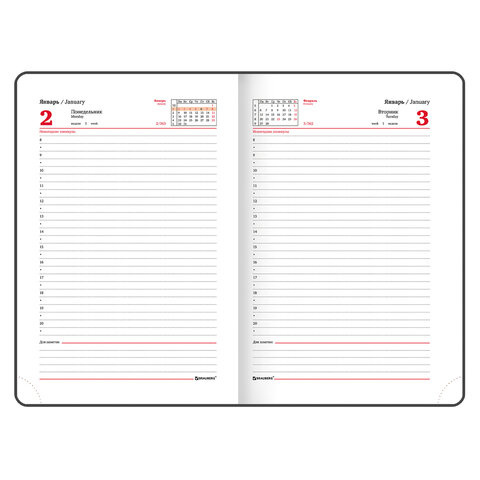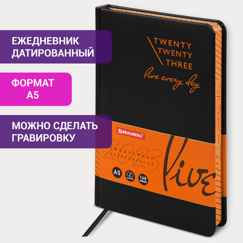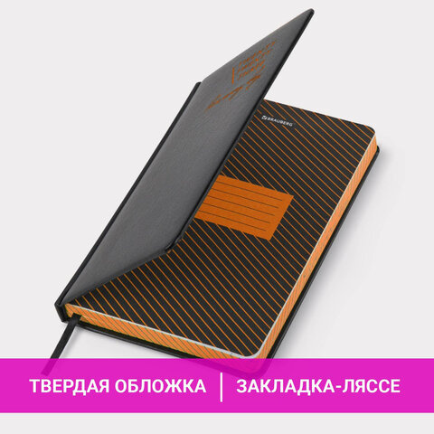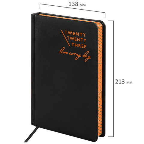 Внутренний блок включает 168 листов белой бумаги плотностью 70 г/м2. Каждая страничка имеет перфорированный угол. Благодаря стандартному формату А5 (138х213 мм) ежедневник удобно использовать как в офисе, так и на выездных деловых встречах. Жесткая книжная обложка стилизована под гладкую кожу. Материал обложки черного цвета подходит для горячего тиснения и при лазерной гравировке меняет цвет на оранжевый. Срез ежедневника окрашен в цвет термотиснения, а форзац - в цвет обложки, что придает ему особый шарм. Дополнением является закладка-ляссе, с помощью которой при необходимости можно быстро открыть ежедневник на нужной странице. Помимо прочего, ежедневник снабжен обширным справочным материалом.