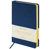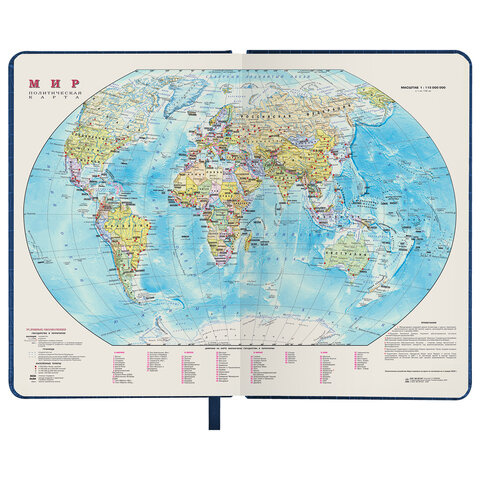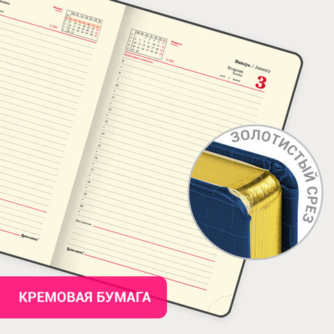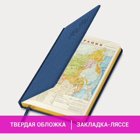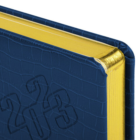 Внутренний блок включает 168 листов тонированной бумаги плотностью 70 г/м2. Каждая страничка имеет перфорированный угол. Благодаря стандартному формату А5 (138х213 мм) ежедневник удобно использовать как в офисе, так и на выездных деловых встречах. Твердая обложка стилизована под кожу крокодила. Материал обложки насыщенного синего цвета подходит для горячего тиснения. Форзац ежедневника представлен картами мира и России. Срез ежедневника фольгирован золотой фольгой, что придает ему особый шарм. Дополнением является закладка-ляссе, с помощью которой при необходимости можно быстро открыть ежедневник на нужной странице. Помимо прочего, ежедневник снабжен обширным справочным материалом.