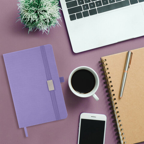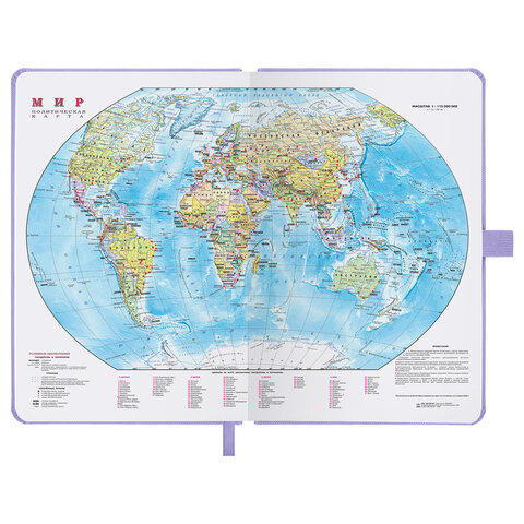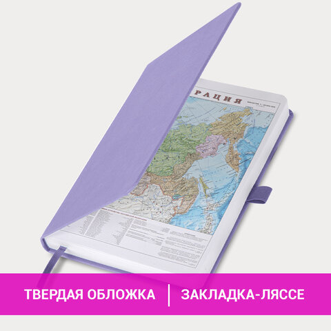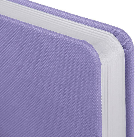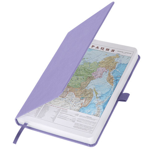Внутренний блок включает 168 листов белой бумаги плотностью 70 г/м2. Каждая страничка имеет перфорированный угол. Благодаря стандартному формату А5 (138х213 мм) ежедневник удобно использовать как в офисе, так и на выездных деловых встречах. Жесткая книжная обложка в нежном сиреневом цвете стилизована под искусственную кожу с мелким рисунком, фиксируется резинкой, поэтому ежедневник не откроется в сумке или портфеле и страницы не помнутся. Материал обложки подходит для горячего тиснения. Для удобства пользования ежедневник снабжен держателем для фиксации ручки. Форзац ежедневника представлен картами мира и России. Дополнением является закладка-ляссе, с помощью которой при необходимости можно быстро открыть ежедневник на нужной странице. Помимо прочего, ежедневник снабжен обширным справочным материалом.