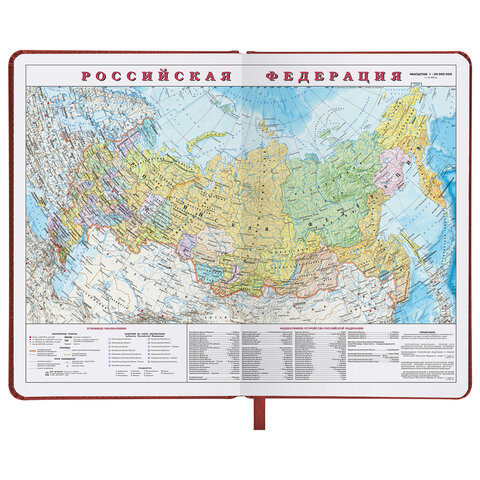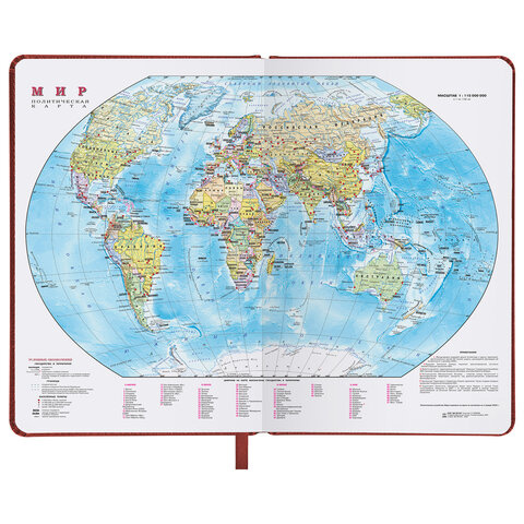Внутренний блок включает 168 листов белой бумаги плотностью 70 г/м2. Каждая страничка имеет перфорированный угол. Благодаря стандартному формату А5 ежедневник удобно использовать как в офисе, так и на выездных деловых встречах. Обложка с прошивкой по периметру имеет ярко выраженную текстуру под кожу, приятную на ощупь. Материал обложки подходит для горячего тиснения. Форзац ежедневника представлен картами мира и России. Дополнением является закладка-ляссе, с помощью которой при необходимости можно быстро открыть ежедневник на нужной странице. Помимо прочего, ежедневник снабжен обширным справочным материалом. Выполнен в благородном коричневом цвете.