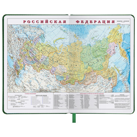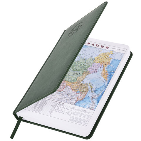 Внутренний блок включает 168 листов белой бумаги плотностью 70 г/м2. Каждая страничка имеет перфорированный угол. Благодаря стандартному формату А5 ежедневник удобно использовать как в офисе, так и на выездных деловых встречах. Обложка с прошивкой по периметру имеет ярко выраженную текстуру под кожу, приятную на ощупь. Материал обложки подходит для горячего тиснения. Форзац ежедневника представлен картами мира и России. Дополнением является закладка-ляссе, с помощью которой при необходимости можно быстро открыть ежедневник на нужной странице. Помимо прочего, ежедневник снабжен обширным справочным материалом. Выполнен в насыщенном зеленом цвете.