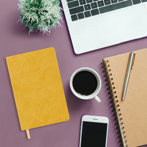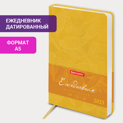 Ежедневник датированный 2023 А5 138x213 мм BRAUBERG 'Foliage', под кожу, желтый, 114102