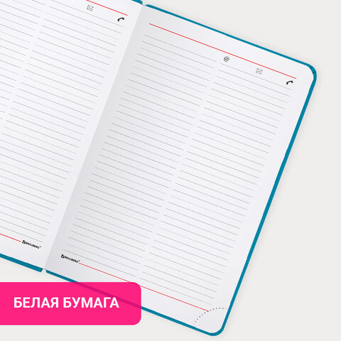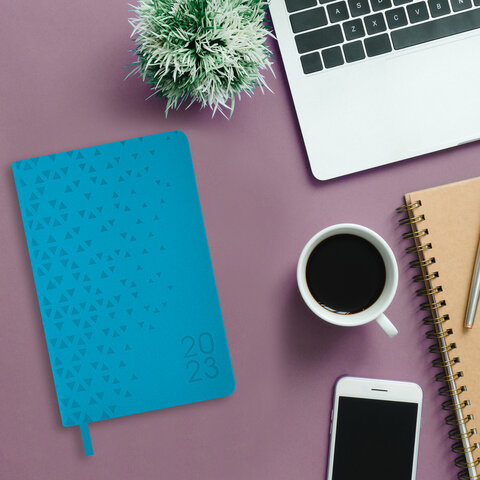 Внутренний блок включает 168 листов белой бумаги плотностью 70 г/м2. Каждая страничка имеет перфорированный угол. Благодаря стандартному формату А5 (138х213 мм) датированный ежедневник удобно использовать как в офисе, так и на выездных деловых встречах. Мягкая (интегральная) обложка, под фактурную кожу яркого бирюзового цвета с легким блеском имеет декоративное тиснение, что придает ежедневнику особый шарм. Материал обложки подходит для горячего тиснения. Дополнением является закладка-ляссе, с помощью которой при необходимости можно быстро открыть ежедневник на нужной странице. Помимо прочего, ежедневник снабжен обширным справочным материалом.