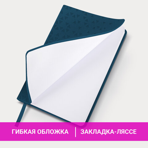 Внутренний блок включает 168 листов белой бумаги плотностью 70 г/м2. Каждая страничка имеет перфорированный угол. Благодаря стандартному формату А5 (138х213 мм) датированный ежедневник удобно использовать как в офисе, так и на выездных деловых встречах. Мягкая (интегральная) обложка, под фактурную кожу благородного синего цвета с легким блеском имеет декоративное тиснение, что придает ежедневнику особый шарм. Материал обложки подходит для горячего тиснения. Дополнением является закладка-ляссе, с помощью которой при необходимости можно быстро открыть ежедневник на нужной странице. Помимо прочего, ежедневник снабжен обширным справочным материалом.