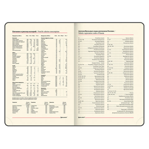 Внутренний блок включает 168 листов тонированной бумаги плотностью 70 г/м2. Каждая страничка имеет перфорированный угол. Благодаря стандартному формату А5 (138х213 мм) ежедневник удобно использовать как в офисе, так и на выездных деловых встречах. Твердая обложка стилизована под гладкую кожу строгого черного цвета. Материал обложки подходит для горячего тиснения. Форзац ежедневника представлен картами мира и России. Дополнением является закладка-ляссе, с помощью которой при необходимости можно быстро открыть ежедневник на нужной странице. Помимо прочего, ежедневник снабжен обширным справочным материалом.