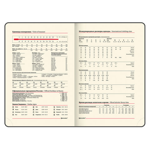 Внутренний блок включает 168 листов тонированной бумаги плотностью 70 г/м2. Каждая страничка имеет перфорированный угол. Благодаря стандартному формату А5 (138х213 мм) датированный ежедневник удобно использовать как в офисе, так и на выездных деловых встречах. Твердая обложка стилизована под гладкую кожу классического коричневого цвета. Материал обложки подходит для горячего тиснения. Форзац ежедневника представлен картами мира и России. Дополнением является закладка-ляссе, с помощью которой при необходимости можно быстро открыть ежедневник на нужной странице. Помимо прочего, ежедневник снабжен обширным справочным материалом.