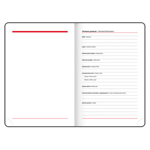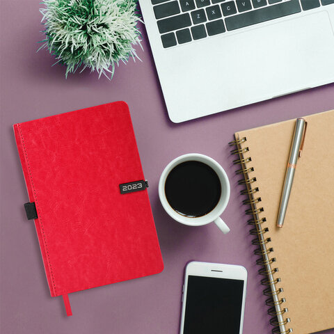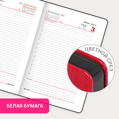Внутренний блок включает 168 листов белой бумаги плотностью 70 г/м2. Каждая страничка имеет перфорированный угол. Благодаря стандартному формату А5 (138х213 мм) ежедневник удобно использовать как в офисе, так и на выездных деловых встречах. Твердая обложка стилизована под гладкую кожу красного цвета. Материал обложки подходит для горячего тиснения. Для удобства пользования ежедневник снабжен держателем для ручки. Цветной срез в контраст обложки придает ежедневнику особый шарм. Дополнением является закладка-ляссе, с помощью которой при необходимости можно быстро открыть ежедневник на нужной странице. Помимо прочего, ежедневник снабжен обширным справочным материалом.