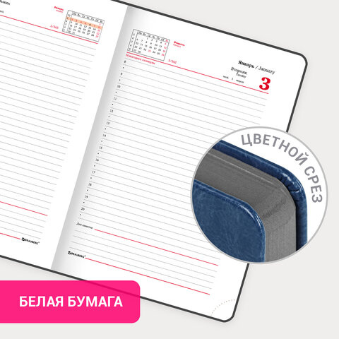 Внутренний блок включает 168 листов белой бумаги плотностью 70 г/м2. Каждая страничка имеет перфорированный угол. Благодаря стандартному формату А5 (138х213 мм) ежедневник удобно использовать как в офисе, так и на выездных деловых встречах. Твердая обложка стилизована под гладкую кожу синего цвета. Материал обложки подходит для горячего тиснения. Для удобства пользования ежедневник снабжен держателем для ручки. Цветной срез в контраст обложки придает ежедневнику особый шарм. Дополнением является закладка-ляссе, с помощью которой при необходимости можно быстро открыть ежедневник на нужной странице. Помимо прочего, ежедневник снабжен обширным справочным материалом.
