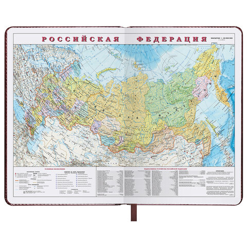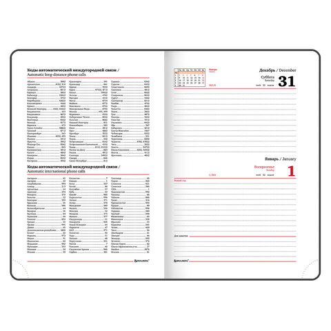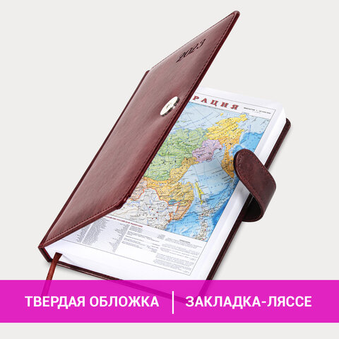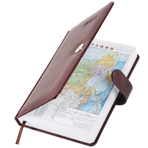 Внутренний блок включает 168 листов белой бумаги плотностью 70 г/м2. Каждая страничка имеет перфорированный угол. Благодаря стандартному формату А5 (138х213 мм) датированный ежедневник удобно использовать как в офисе, так и на выездных деловых встречах. Жесткая книжная обложка, прошитая по периметру, с легкой рельефной фактурой, напоминающей натуральную кожу, фиксируется магнитной застежкой, поэтому ежедневник не откроется в сумке или портфеле и страницы не помнутся. Материал обложки подходит для горячего тиснения. Форзац ежедневника представлен картами мира и России. Дополнением является закладка-ляссе, с помощью которой при необходимости можно быстро открыть ежедневник на нужной странице. Помимо прочего, ежедневник снабжен обширным справочным материалом. Выполнен в благородном коричневом цвете.