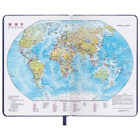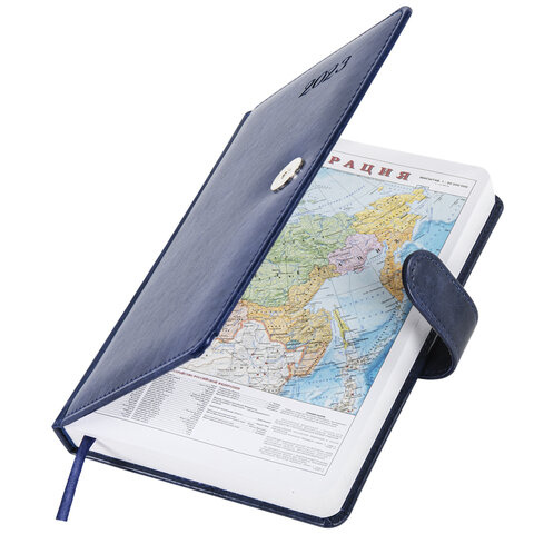 Внутренний блок включает 168 листов белой бумаги плотностью 70 г/м2. Каждая страничка имеет перфорированный угол. Благодаря стандартному формату А5 ежедневник удобно использовать как в офисе, так и на выездных деловых встречах. Жесткая книжная обложка, прошитая по периметру, с легкой рельефной фактурой, напоминающей натуральную кожу, фиксируется магнитной застежкой, поэтому ежедневник не откроется в сумке или портфеле и страницы не помнутся. Материал обложки подходит для горячего тиснения. Форзац ежедневника представлен картами мира и России. Дополнением является закладка-ляссе, с помощью которой при необходимости можно быстро открыть ежедневник на нужной странице. Помимо прочего, ежедневник снабжен обширным справочным материалом. Выполнен в насыщенном синем цвете.