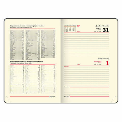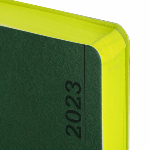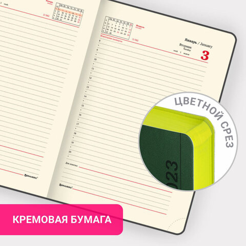 Внутренний блок включает 168 листов кремовой бумаги плотностью 70 г/м2. Каждая страничка имеет перфорированный угол. Благодаря стандартному формату А5 (138х213 мм) ежедневник удобно использовать как в офисе, так и на выездных деловых встречах. Мягкая интегральная обложка стилизована под гладкую кожу утонченного темно-зеленого цвета. Материал обложки подходит для горячего тиснения. Срез и форзац ежедневника окрашены в контрастный с обложкой цвет, что придает ему особый шарм. Дополнением является закладка-ляссе, с помощью которой при необходимости можно быстро открыть ежедневник на нужной странице. Помимо прочего, ежедневник снабжен обширным справочным материалом.