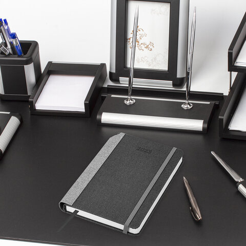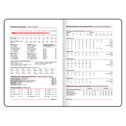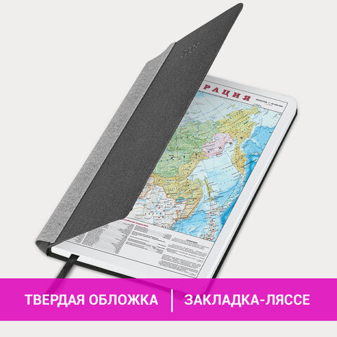Внутренний блок включает 168 листов белой бумаги плотностью 70 г/м2. Каждая страничка имеет перфорированный угол. Благодаря стандартному формату А5 (138х213 мм) ежедневник удобно использовать как в офисе, так и на выездных деловых встречах. Жесткая книжная обложка стилизована под искусственную кожу с текстурой льна, фиксируется резинкой, поэтому ежедневник не откроется в сумке или портфеле и страницы не помнутся. Материал обложки подходит для горячего тиснения. Для удобства пользования ежедневник снабжен клапаном для фиксации ручки. Форзац ежедневника представлен картами мира и России. Дополнением является закладка-ляссе, с помощью которой при необходимости можно быстро открыть ежедневник на нужной странице. Помимо прочего, ежедневник снабжен обширным справочным материалом. Выполнен в стильном сочетании черного и серого цветов.