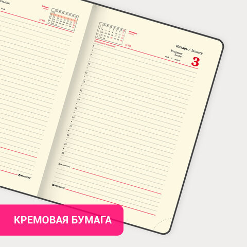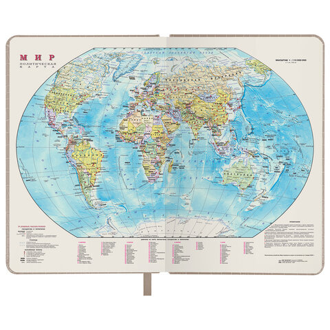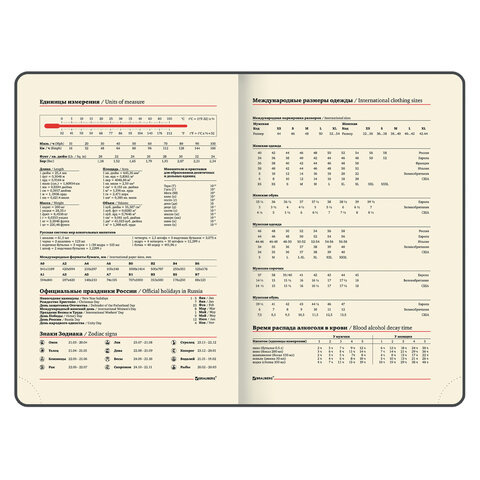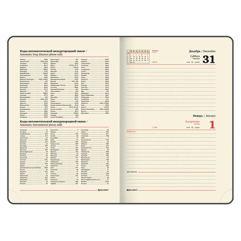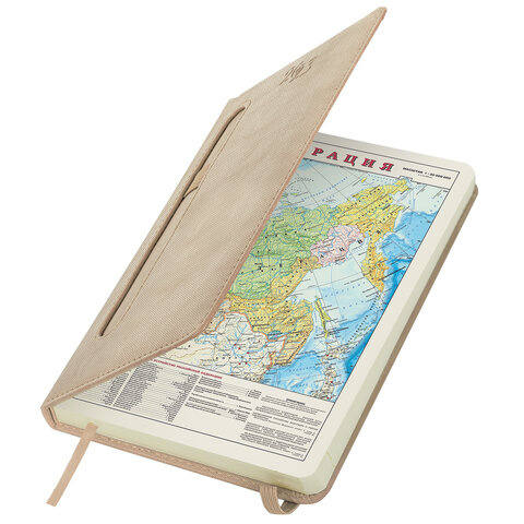 Внутренний блок включает 168 листов тонированной бумаги плотностью 70 г/м2. Каждая страничка имеет перфорированный угол. Благодаря стандартному формату А5 (138х213 мм) датированный ежедневник удобно использовать как в офисе, так и на выездных деловых встречах. Твердая обложка стилизована под старую кожу в рубчик и выполнена в благородном бежевом цвете. Подходит для горячего тиснения. Снабжен резинкой-фиксатором, благодаря чему ежедневник не откроется в сумке или портфеле. Форзац ежедневника представлен картами мира и России. Дополнением является закладка-ляссе, с помощью которой при необходимости можно быстро открыть ежедневник на нужной странице и держатель для ручки. Помимо прочего, ежедневник снабжен справочным материалом.