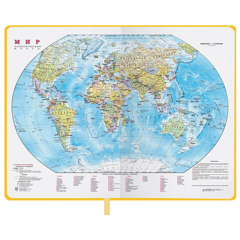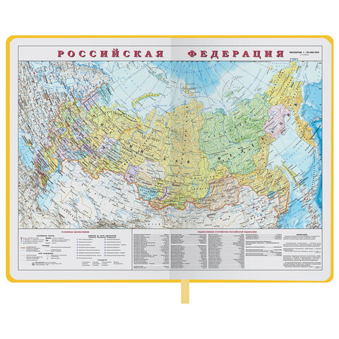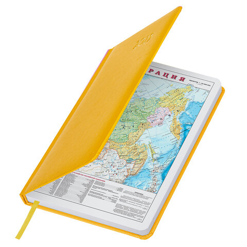 Внутренний блок включает 168 листов белой бумаги плотностью 70 г/м2. Каждая страничка имеет перфорированный угол. Благодаря стандартному формату А5 (138х213 мм) ежедневник удобно использовать как в офисе, так и на выездных деловых встречах. Имеет приятную на ощупь обложку желтого цвета с гладкой матовой поверхностью. Жесткая книжная обложка с легкой рельефной фактурой напоминает натуральную кожу. Материал обложки - балакрон, подходит для тиснения только фольгой. Форзац ежедневника представлен картами мира и России. Дополнением является закладка-ляссе, с помощью которой при необходимости можно быстро открыть ежедневник на нужной странице. Помимо прочего, ежедневник снабжен обширным справочным материалом.