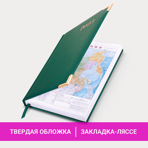 Внутренний блок включает 168 листов белой бумаги плотностью 70 г/м2. Каждая страничка имеет перфорированный угол. Благодаря стандартному формату А5 (138х213 мм) ежедневник удобно использовать как в офисе, так и на выездных деловых встречах. Твердая обложка стилизована под гладкую кожу благородного зеленого цвета. Подходит для горячего тиснения. Ежедневник имеет металлические уголки, что придает ему особый шарм. Форзац ежедневника представлен картами мира и России. Дополнением является закладка-ляссе, с помощью которой при необходимости можно быстро открыть ежедневник на нужной странице. Помимо прочего, ежедневник снабжен обширным справочным материалом.