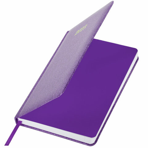 Внутренний блок включает 168 листов белой бумаги плотностью 70 г/м2. Каждая страничка имеет перфорированный угол. Благодаря стандартному формату А5 (138х213 мм) ежедневник удобно использовать как в офисе, так и на выездных деловых встречах. Твердая обложка стилизована под кожу с глиттером стильного фиолетового цвета. Подходит для тиснения фольгой. Дополнением является закладка-ляссе, с помощью которой при необходимости можно быстро открыть ежедневник на нужной странице. Помимо прочего, ежедневник снабжен справочным материалом.