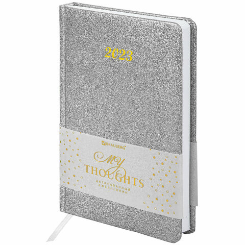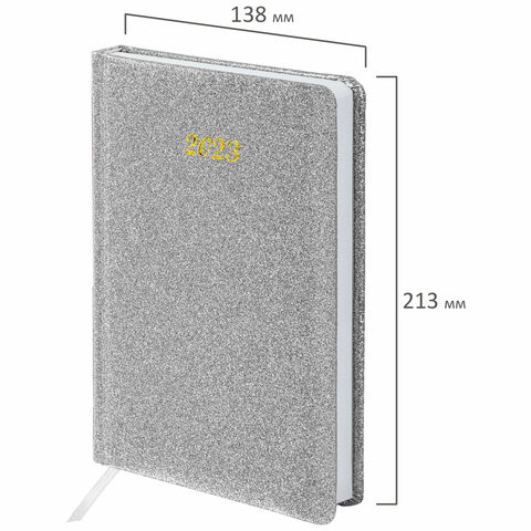 Ежедневник датированный 2023 А5 138x213 мм BRAUBERG 'Sparkle', под кожу, блестки, серебристый, 11411