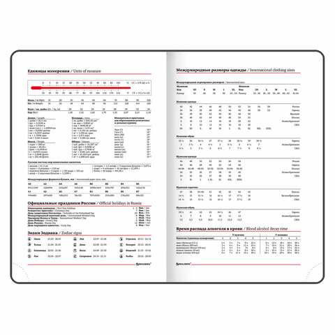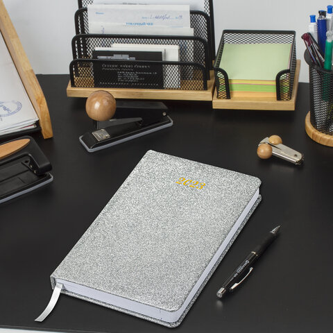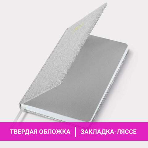 Внутренний блок включает 168 листов белой бумаги плотностью 70 г/м2. Каждая страничка имеет перфорированный угол. Благодаря стандартному формату А5 (138х213 мм) ежедневник удобно использовать как в офисе, так и на выездных деловых встречах. Твердая обложка стилизована под кожу с глиттером благородного серебряного цвета. Подходит для тиснения фольгой. Дополнением является закладка-ляссе, с помощью которой при необходимости можно быстро открыть ежедневник на нужной странице. Помимо прочего, ежедневник снабжен справочным материалом.
