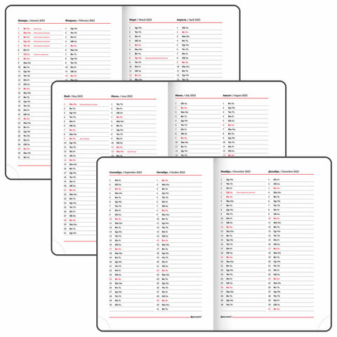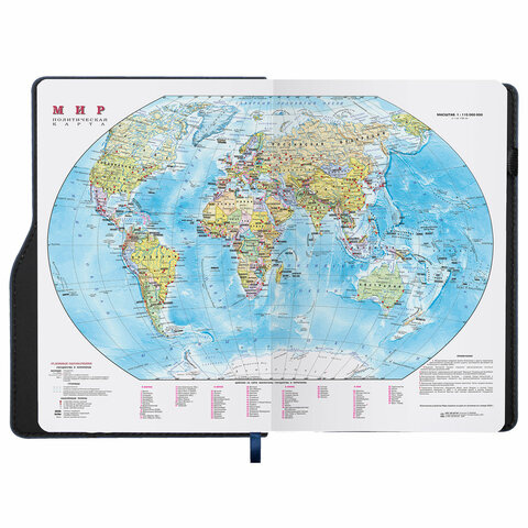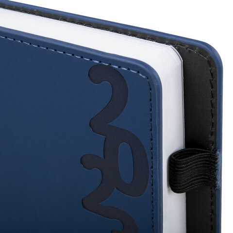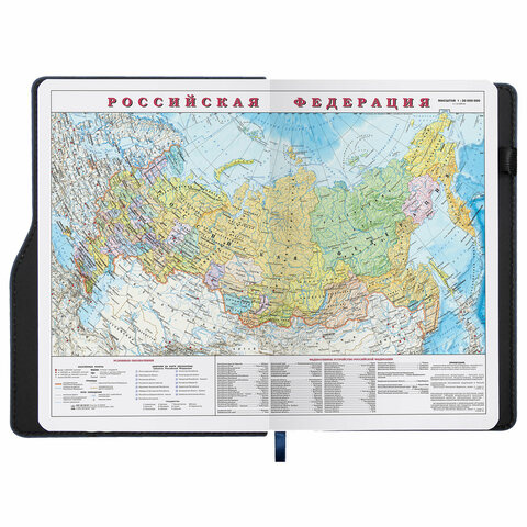Внутренний блок включает 168 листов белой бумаги плотностью 70 г/м2. Каждая страничка имеет перфорированный угол. Благодаря стандартному формату А5 (138х213 мм) ежедневник удобно использовать как в офисе, так и на выездных деловых встречах. Жесткая книжная обложка, прошитая по периметру, с текстурой под гладкую кожу и эффектом софт-тач. Материал обложки подходит для горячего тиснения. Для удобства пользования ежедневник снабжен держателем для ручки. Форзац ежедневника представлен картами мира и России. Дополнением является закладка-ляссе, с помощью которой при необходимости можно быстро открыть ежедневник на нужной странице. Помимо прочего, ежедневник снабжен обширным справочным материалом. Выполнен в классическом синем цвете.
